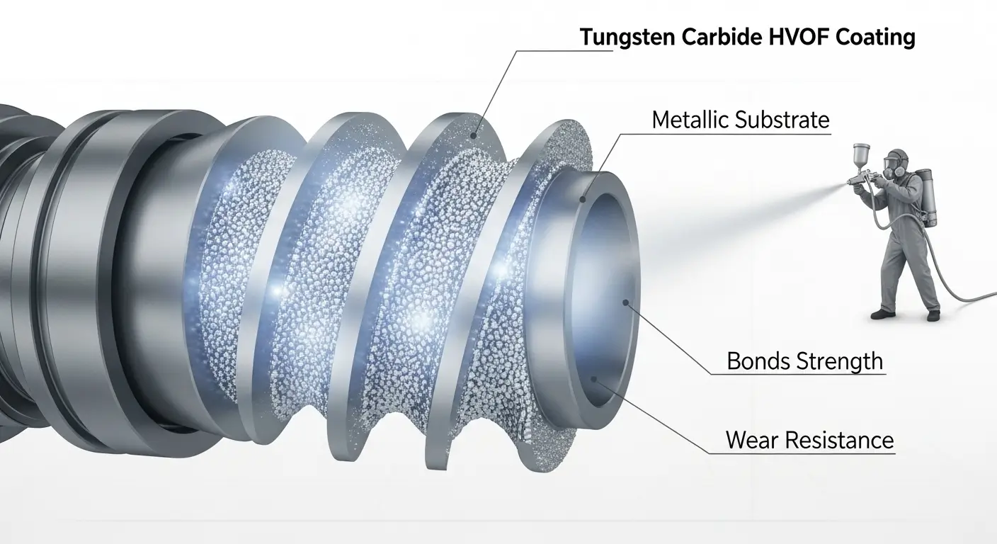 High-Velocity Oxy-Fuel (HVOF) coating is our premium solution for the most extreme wear environments. We propel powdered tungsten carbide at supersonic speeds, creating an exceptionally dense, well-bonded, and wear-resistant coating. The RK 9999 “Lightning” series is the result, offering unparalleled protection against abrasive fillers like glass fiber, calcium carbonate, and talc.