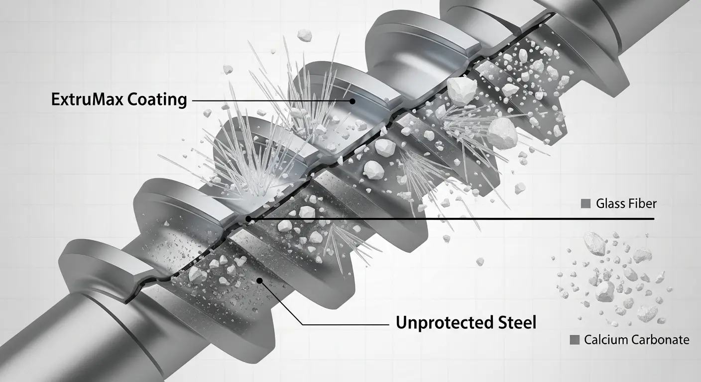 ExtruMax is our proprietary coating technology specifically engineered for screws operating in high-wear environments. It provides a robust, low-friction surface that stands up to the most abrasive fillers, such as high levels of calcium carbonate or glass fiber. By protecting the screw’s critical flight geometry, ExtruMax ensures process stability and dramatically extends component life.